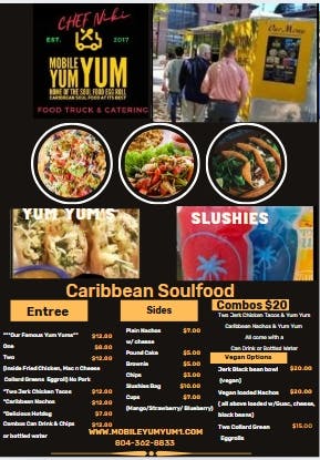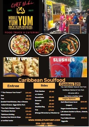Try our Famous Yum Yum Roll that has Fried Chicken, Macaroni & Cheese, Seasoned Collard Greens inside an Eggroll. (NO PORK)